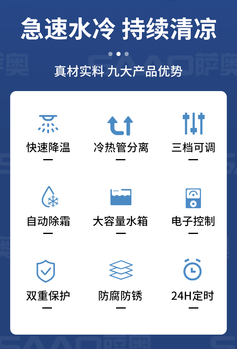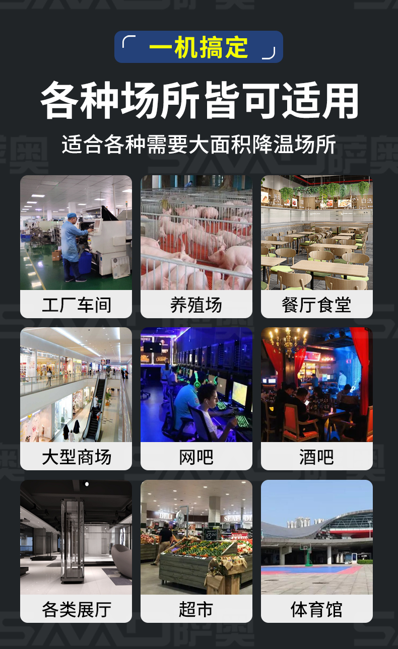 適應各種大面積場所快速降溫:辦公場所降溫 汽車維修降溫 車間制冷 室內制冷 集裝箱制冷 線上降溫 廚房降溫 車間崗位降溫