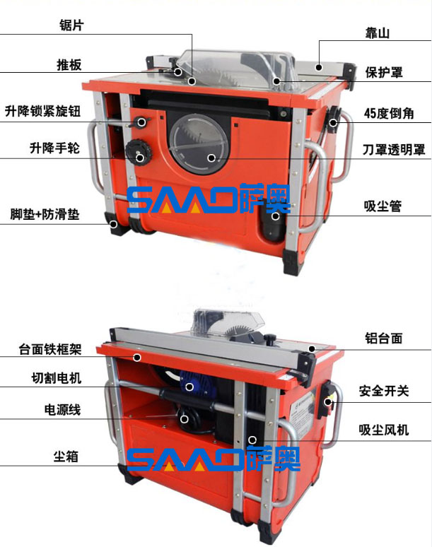 1、 鋸片采用齒輪升降調(diào)節(jié)功能,可切割不同厚度木制品和割槽能力,而且更有效的提高了吸塵效果;