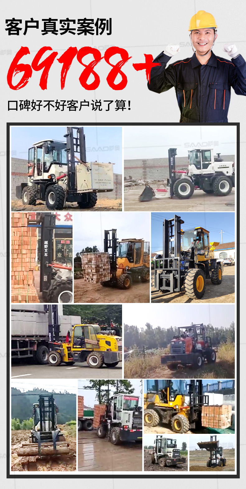 越野叉車可以在坡地和不平地面上進行貨物裝、卸、堆垛及搬運作業,具有良好的機動性、越野性可靠性。其功能多樣,可搭配側移器、調距叉、旋轉器、軟包夾、推出器、側翻叉、側