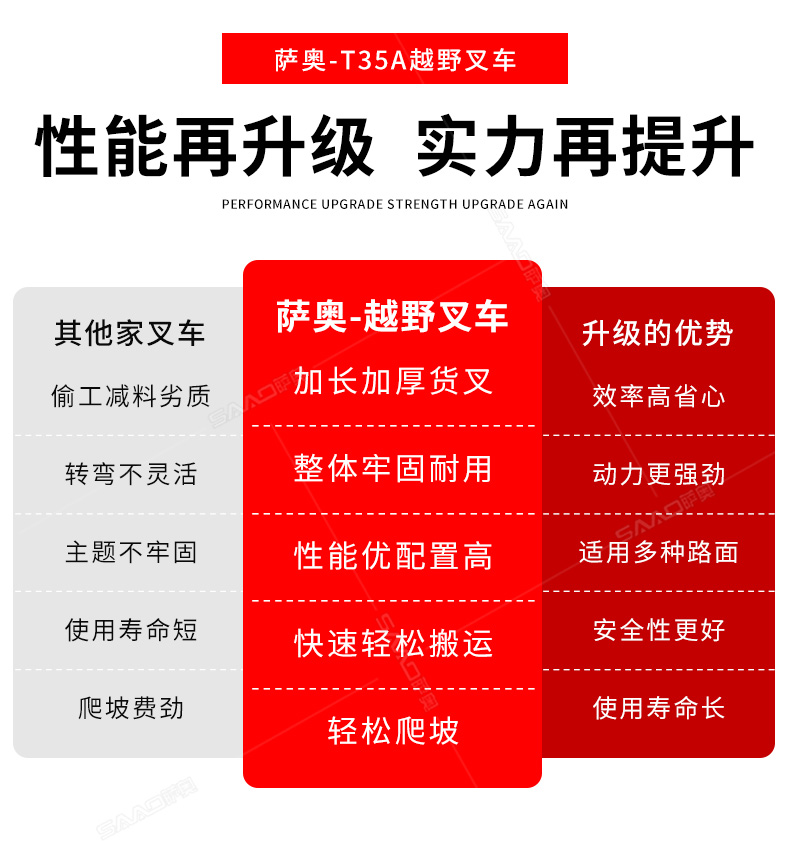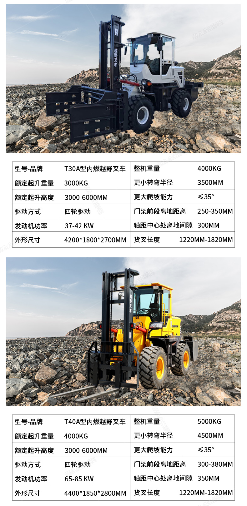 3.普通叉車只能在平整的路面上作業,而越野叉車既可以在普通路面上作業,還可以在山路泥路崎嶇道路作業,輪胎抓地力強,不打滑。