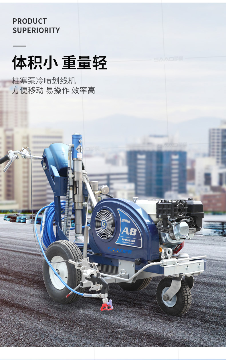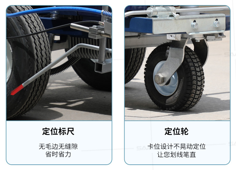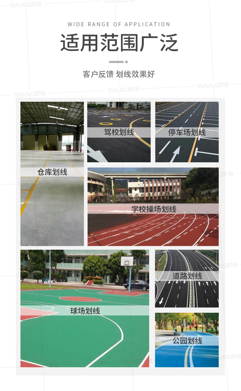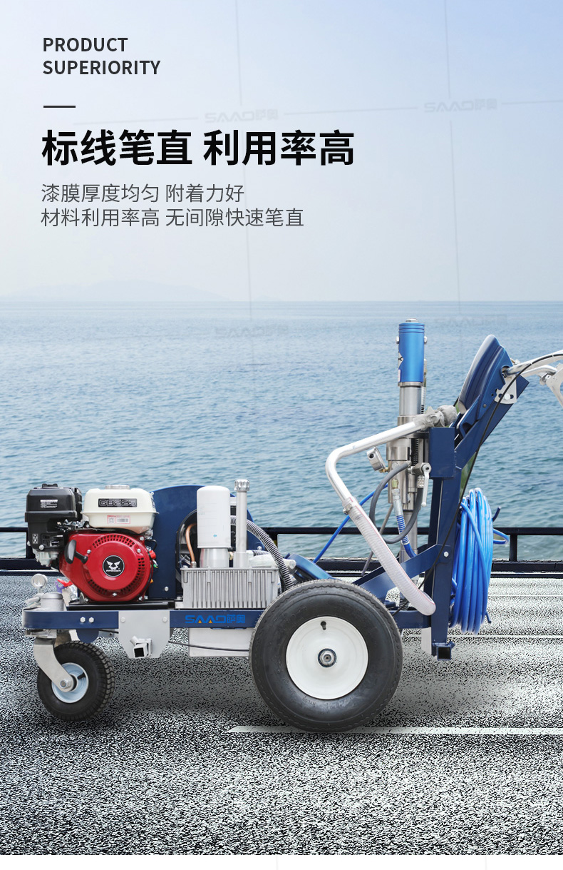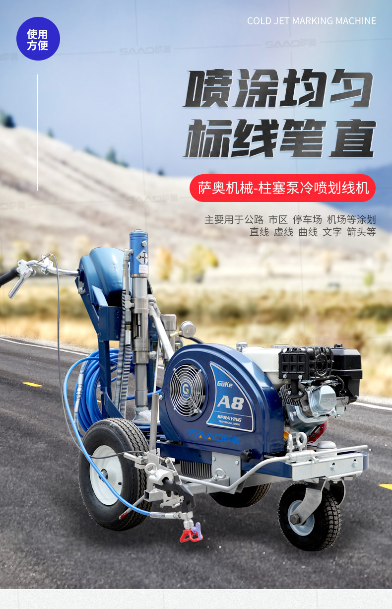主要用于公路、市區(qū)、停車場、機場等涂劃直線、虛線、曲線、文字、箭頭等。具有劃線效果好、速度快、效率高、適用范圍廣、使用方便等優(yōu)點。