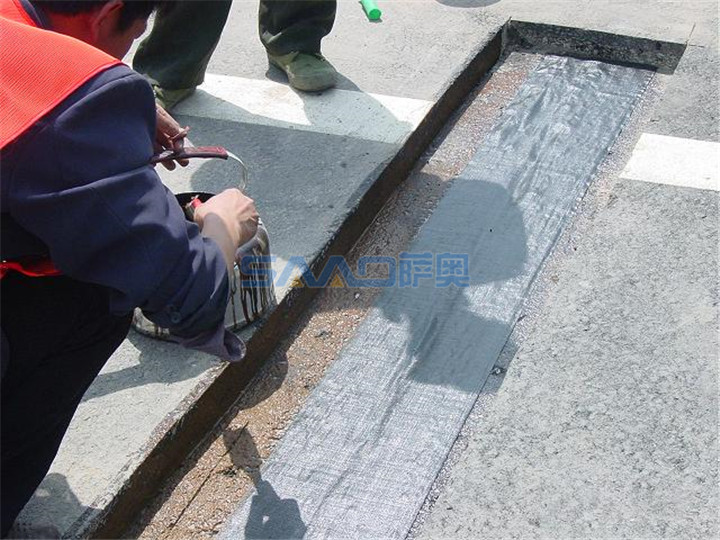 該產(chǎn)品首先可以滿足防水層的厚度,達到良好的防水效果;上薄下厚的結(jié)構(gòu)有效地保證了與基層、面層的粘結(jié)強度,當防護膜與高聚物的熔點低于瀝青混合料溫度時,高強胎基上層的熱熔狀高聚物能很好地起到承上啟下的粘結(jié)作用。置于面層與水溫基層之間,能增強面層與基層間的結(jié)合力,達到了較理想的層間粘結(jié)作用。當路面發(fā)生溫縮時,瀝青面層不僅要承受本身收縮變形的拉應力,而且水溫層的收縮變形會在面層底部引起較大的拉應力,設(shè)置粘結(jié)膜 后,水溫基層對面層的附加應力減小,面層底部所受拉應力下降而不導致造成拉裂。有較大延伸性的抗裂防水粘結(jié)膜作為層間層,可以有效地緩解裂縫處的應力集中,即彈性層間層起到了吸收部分拉伸能量的作用,并承擔部分水平應力。