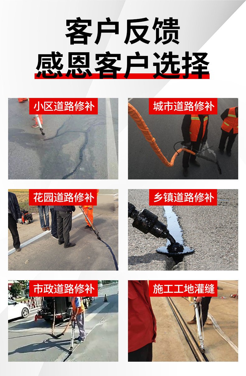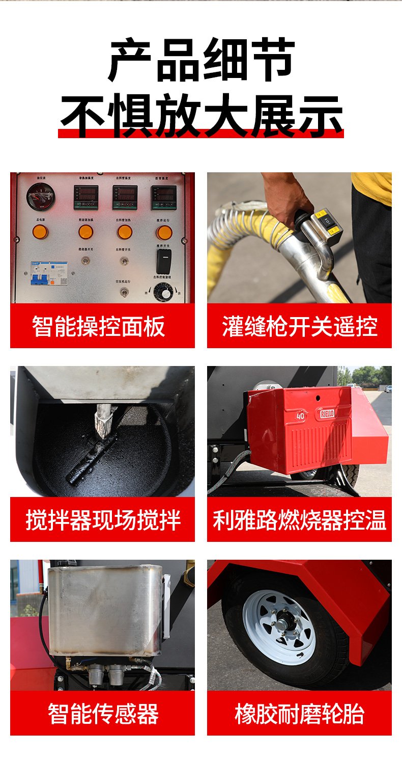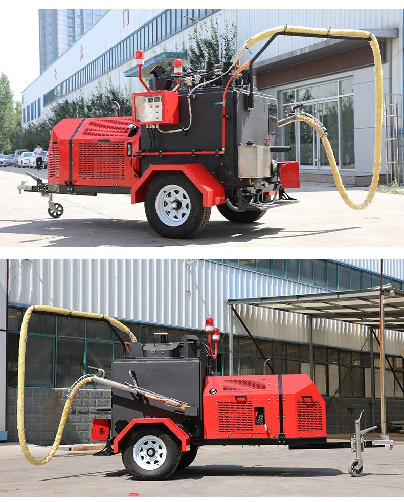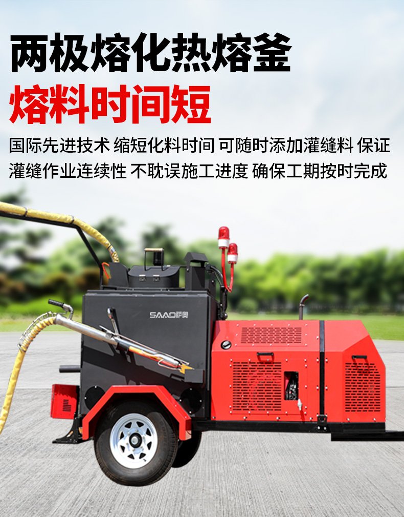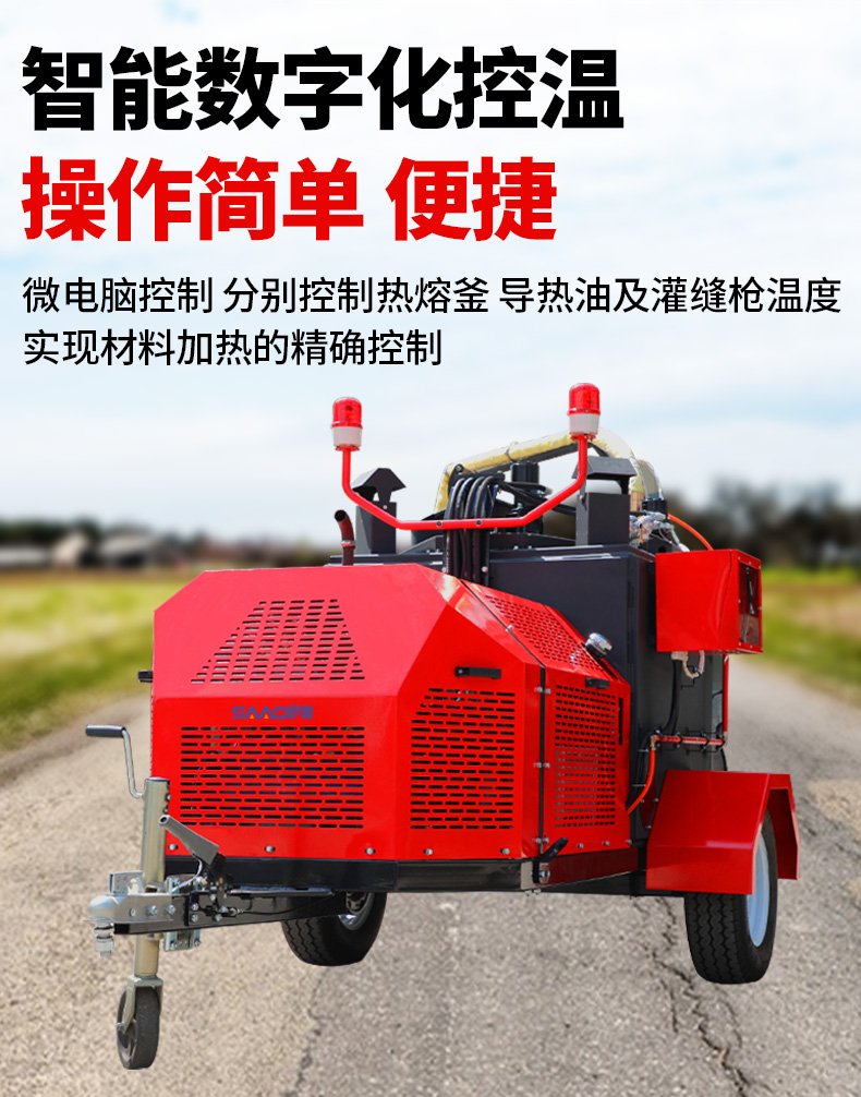 主要功能:通過一根單獨的加熱軟管將加熱融化后的橡膠瀝青基密封材料連續注入清理過的縫隙完成裂縫病害密封處理。輔助灌縫設備完成裂縫密封的設備有(開槽機、熱風槍),密封材料主要是瀝青基橡膠密封膠。