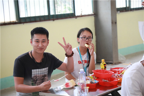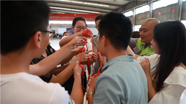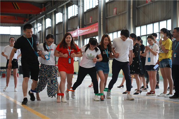 游戲---三人兩足。選出24個人,分成4組,各組選出一個組長來制定總的比賽方案。每組6人站成一排,將相鄰的兩人的腳綁在一起行走,在固定的路程內計算行走時間。每兩個組之間比較,用時少者勝出。