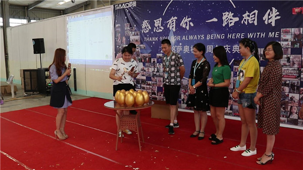 很多時候都不得不感慨一句,薩奧真的是人才濟濟。既然是周年典慶,那么才藝表演自然少不了。在一輪又一輪的才藝表演過后,接下來就展開了砸金蛋的環節。桌上放著10個金蛋,每個金蛋里都放了數額不同的人民幣,選出10個表現好的員工,依次砸金蛋,砸哪個金蛋,哪個金蛋里的錢就屬于自己。是不是很好玩啊?