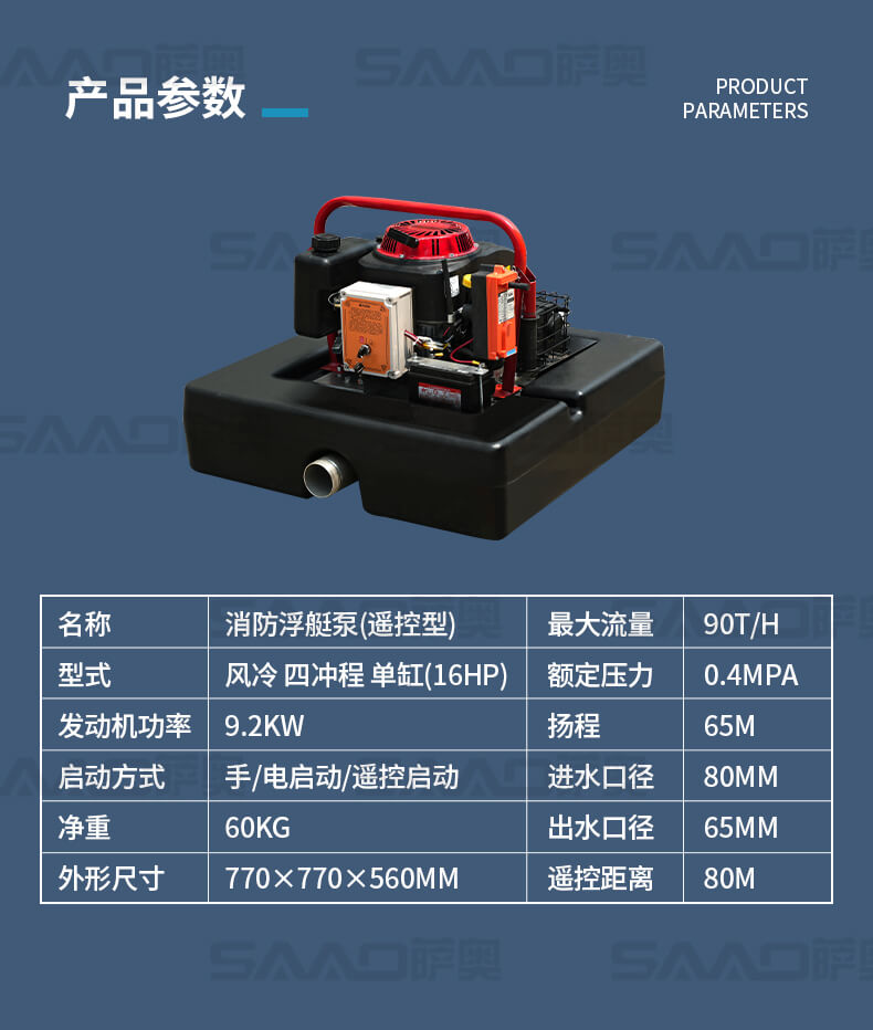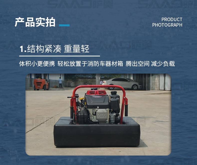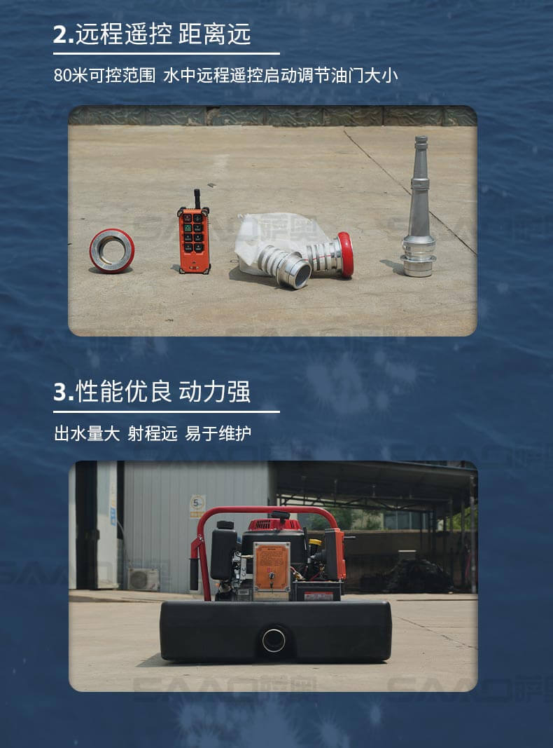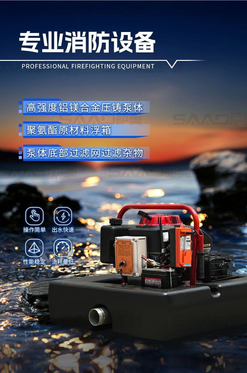 消防浮艇泵適合于城鎮、鄉村及消防車不易到達的火災現場或臨時取水,輕量化設計,聚氨酯原材料浮箱,耗油量低,操作簡單。