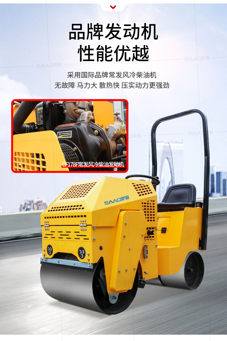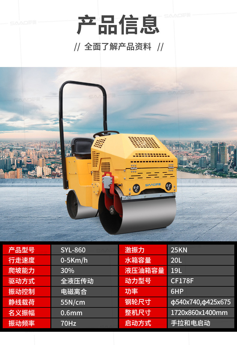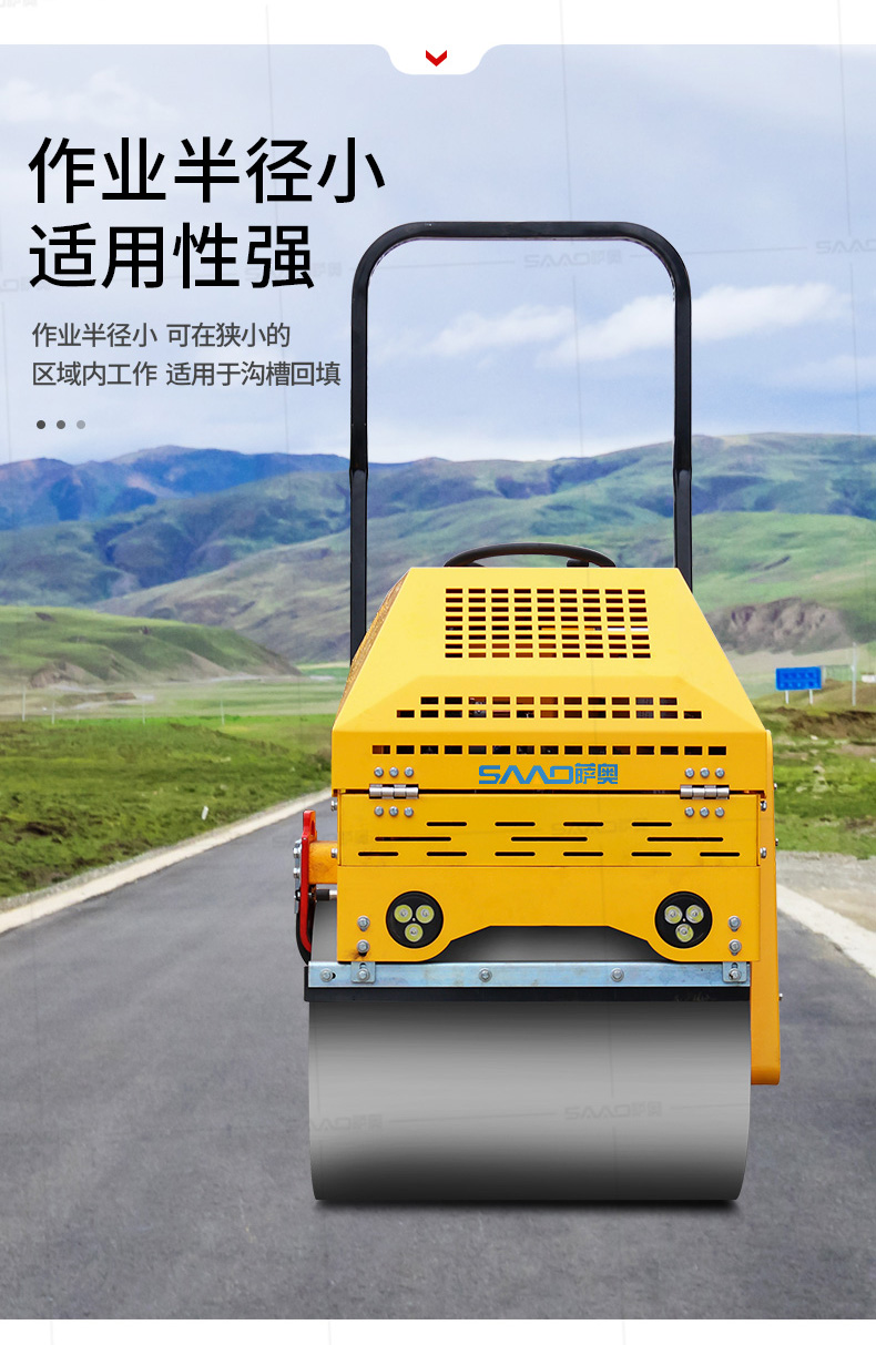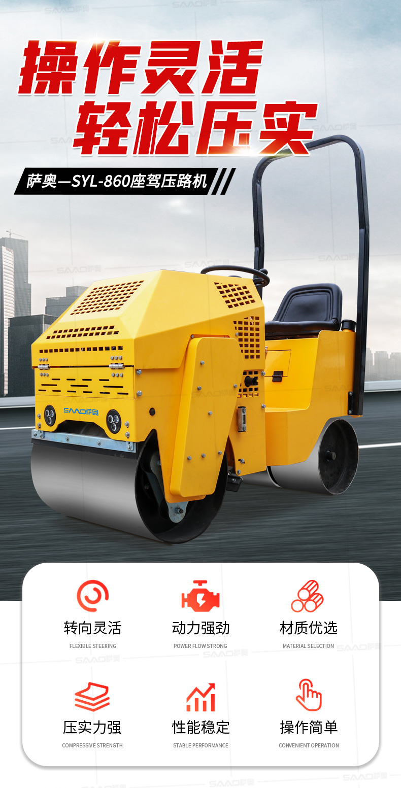 SYL-860座駕壓路機適用于各種溝槽沙土回填壓實、高層建筑地下室土方壓實、小區道路基礎壓實、各種草坪壓實、修修補補及各種小型工程的使用,解決了大型壓路機無法工作區域的壓實